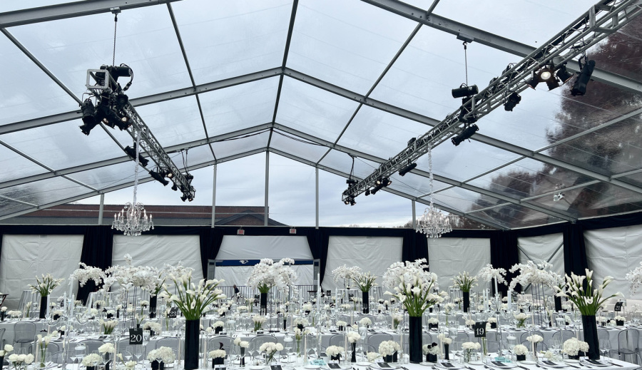 White wash truss lighting provides a clean, even illumination, beautifully highlighting important details like floral arrangement and creating a polished, sophisticated look for the entire