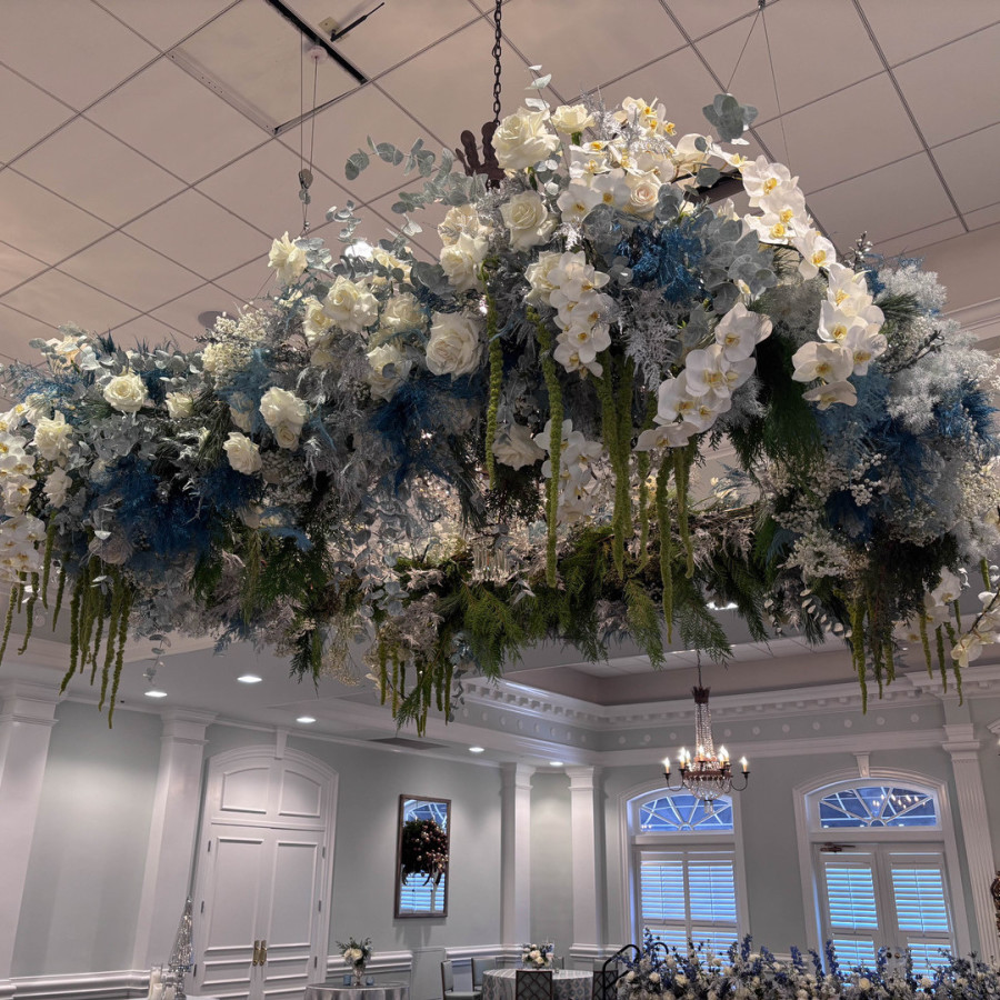 Hanging greenery adds a touch of natural elegance and sophistication to any event, creating a visually stunning atmosphere and enhancing the overall guest experience. We have two options to choose a square grid or a Circle Floral Chandelier